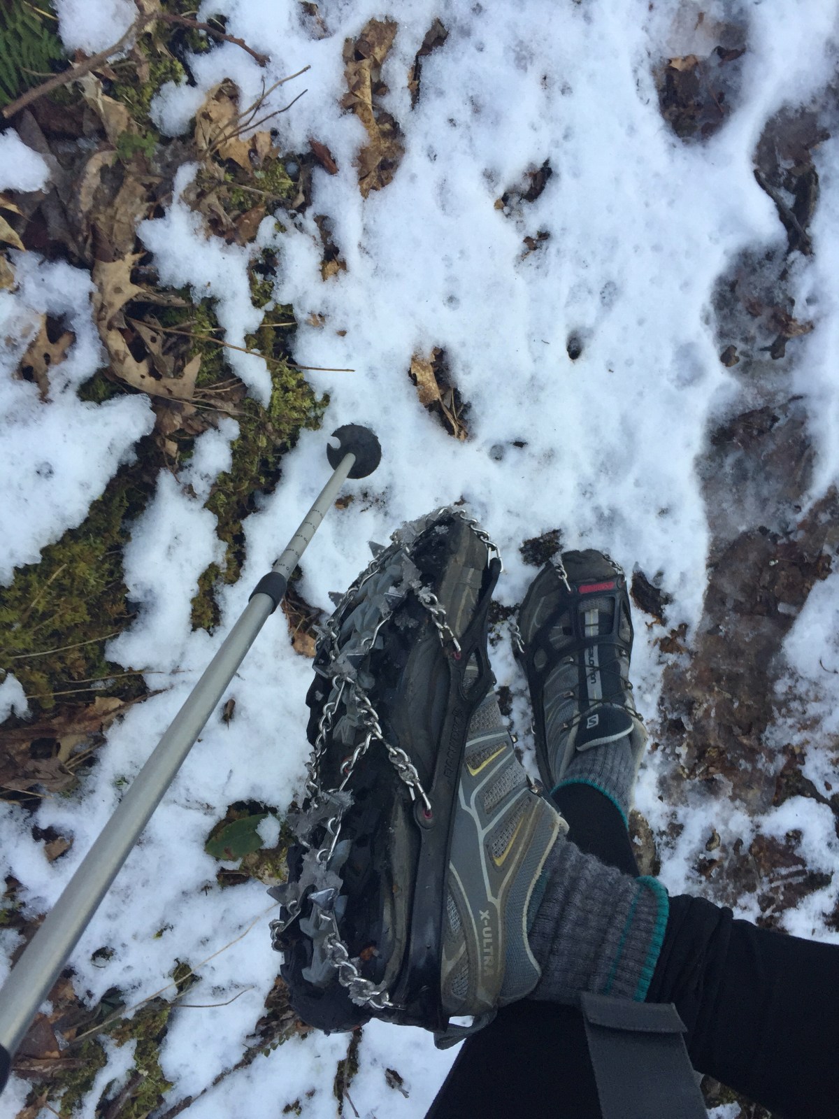My other new gear are Khatoola Microspikes. I have no idea if I spelled that brand right but you can google easier than I can. I bought these at the beginning of the week when I wasn’t sure how much snow there would be or how much it would warm up. It did warm up quite a bit, but there’s still rather a lot of snow, so I got a chance to test them out.