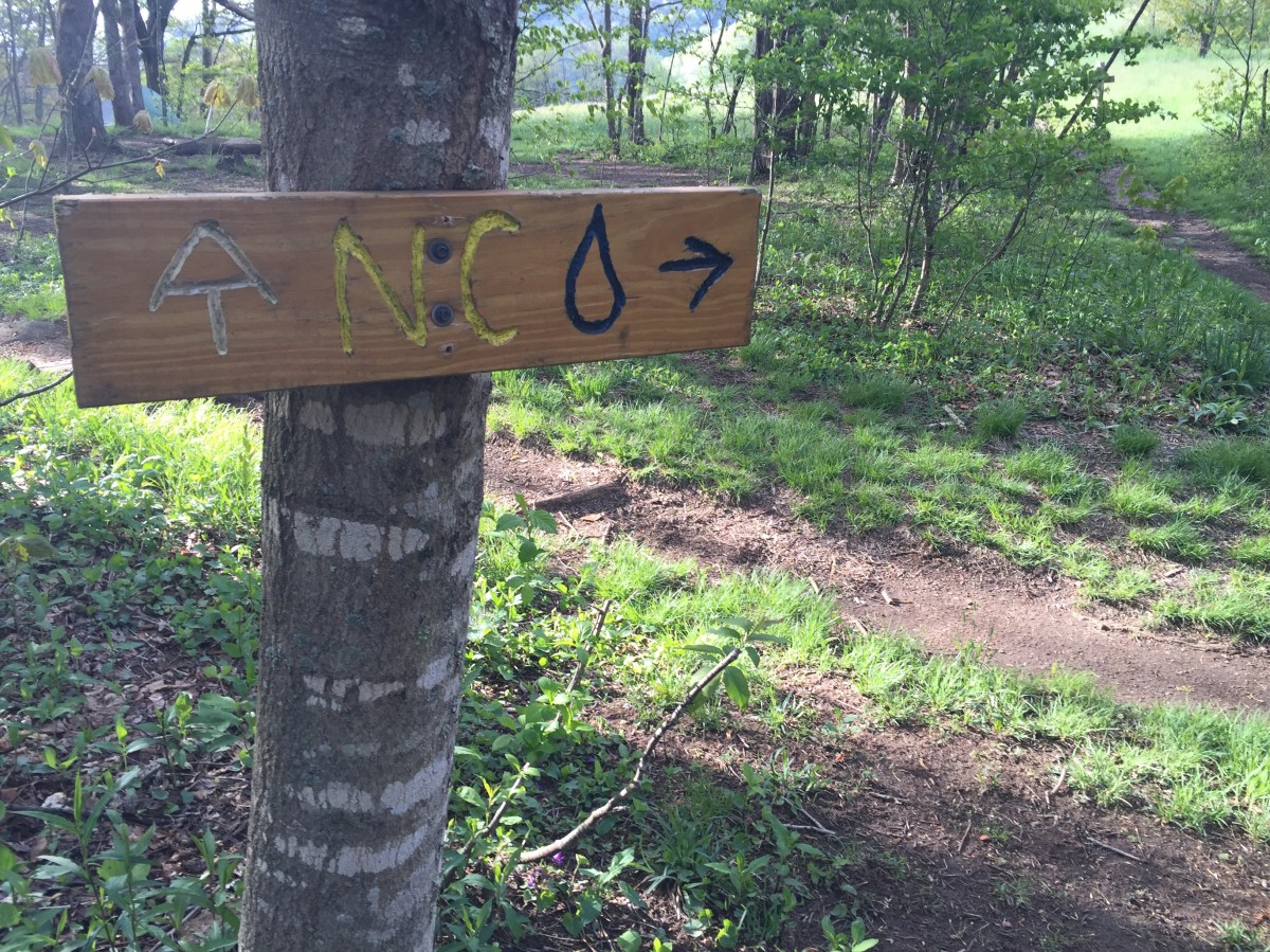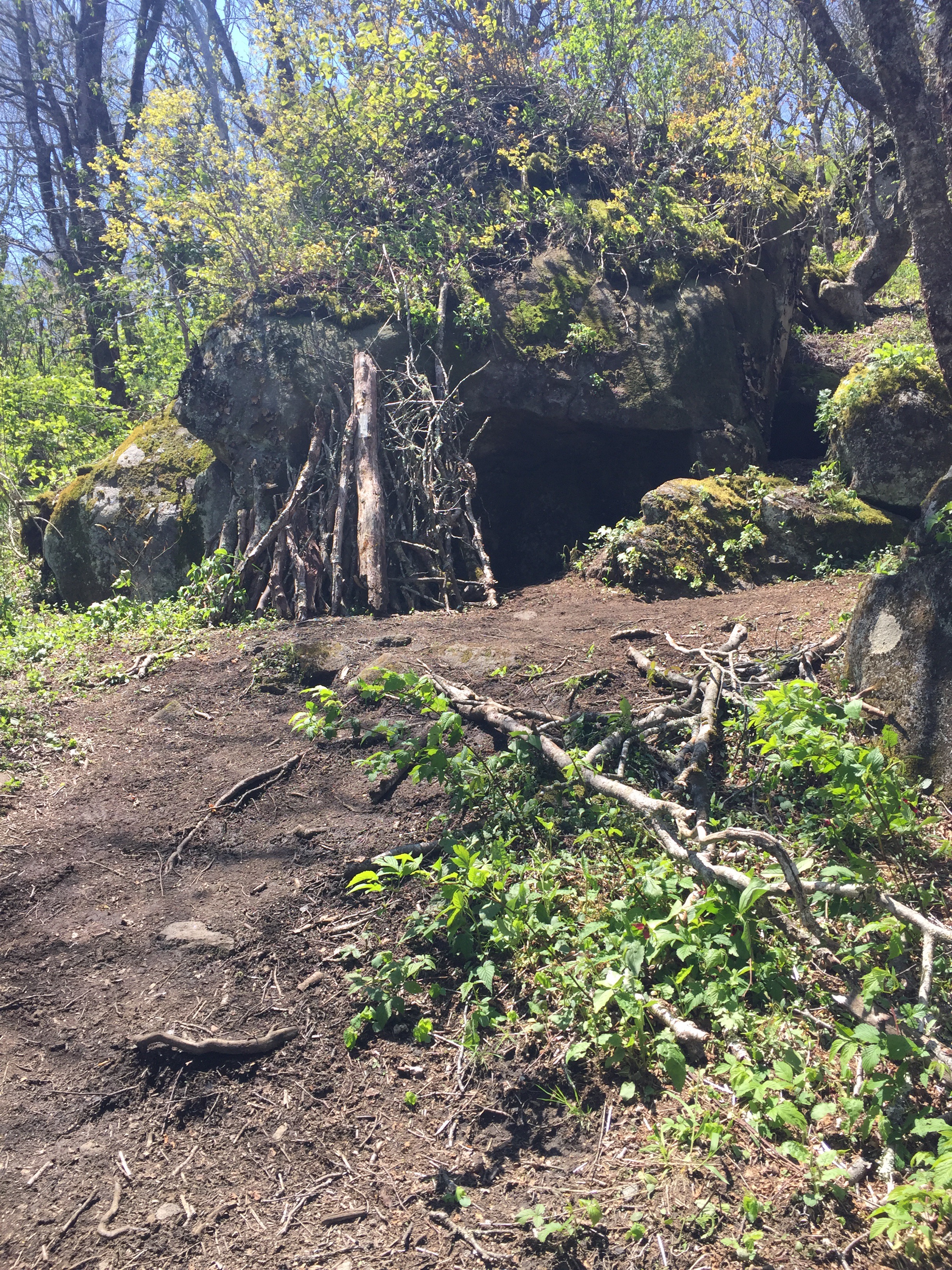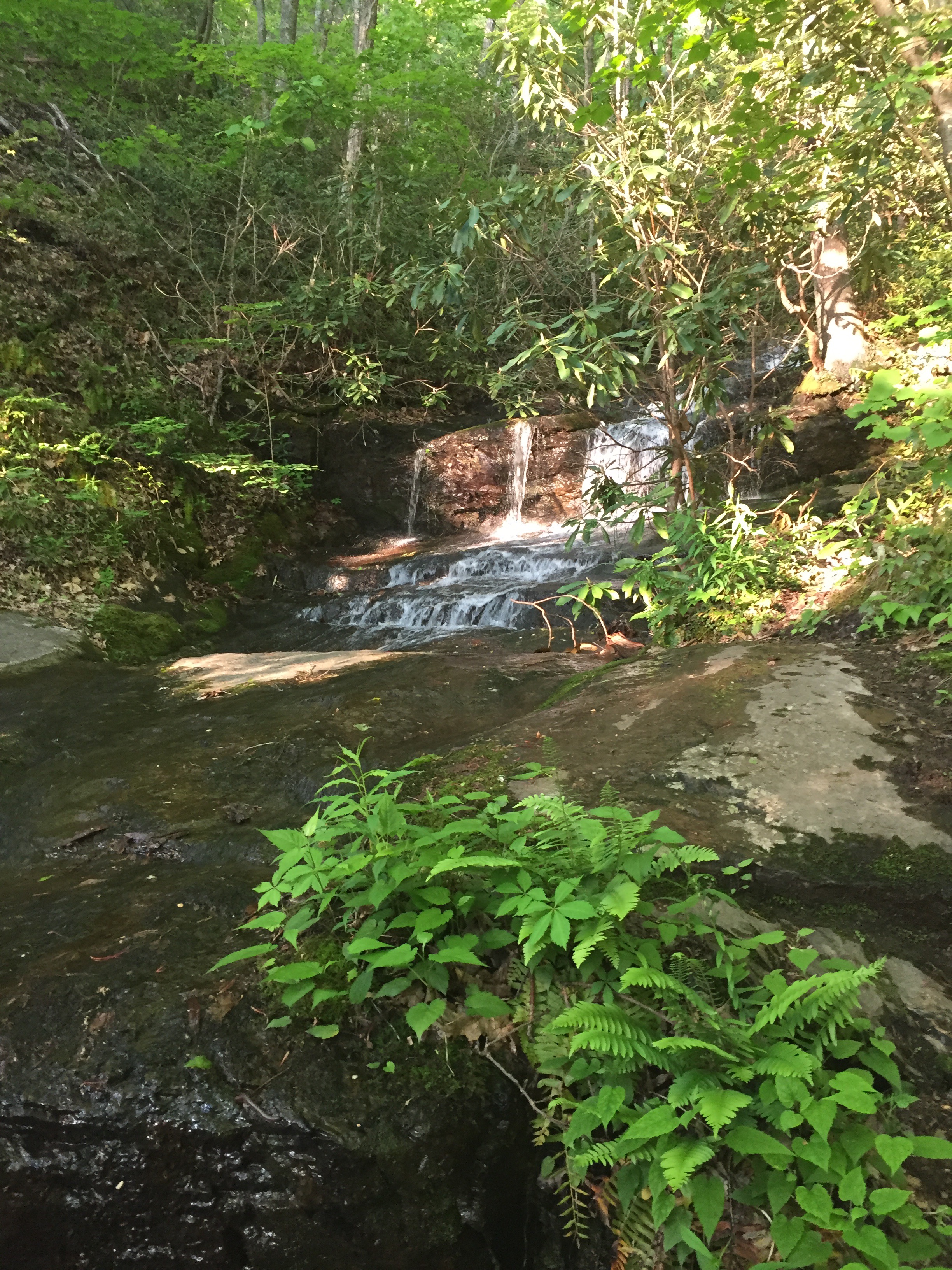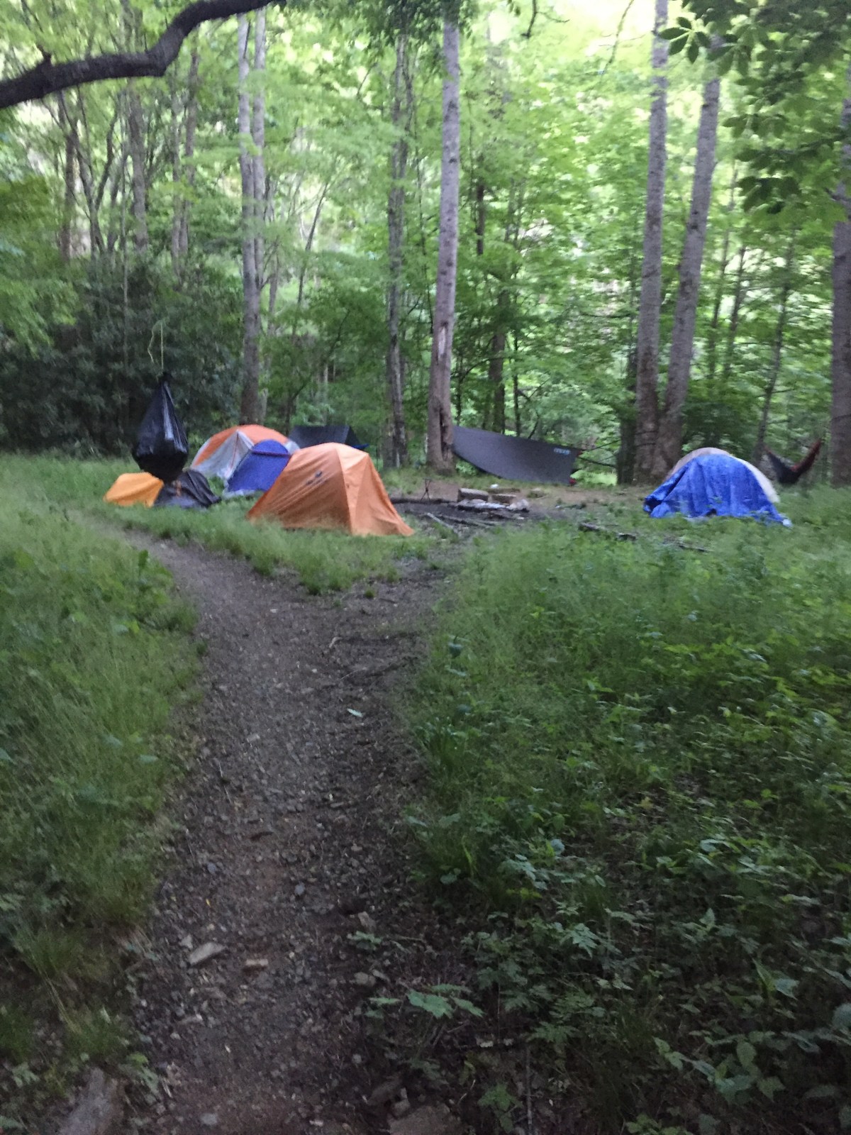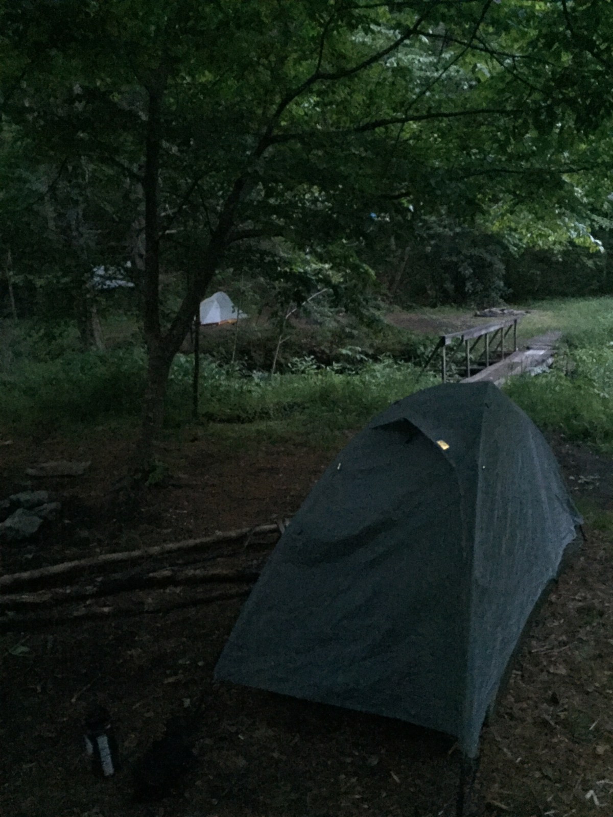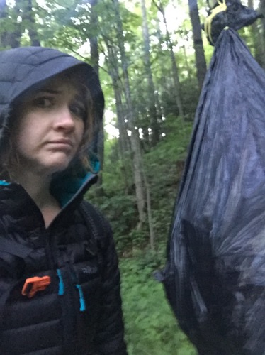 But sleeping on the ground is actually pretty comfortable. It’s definitely better than a shelter, it’s just shelters are more convenient. And so when I woke up at 4:30 (I’m pretty good at internal alarms), I decided on 30 more minutes. And at 5am I said the same thing. It was cold! And at 5:30, I decided to hold child’s pose for…30 minutes. And finally, at 6:30…ish, I started walking. I didn’t trust the creek water (too close to the road, too much runoff) so I hiked half a mile before I stopped for water. This is the tent site I’d sort of meant to stay at, but when I’d seen the other one with people still up and plenty of room (AND a fire going, although not a good fire) just half a mile short, I figured I’d stop early. And good thing, too. For one, it was packed. And for two, look at this pitiful bear hang. (For the record, it should be 15 feet high and 4 feet from the tree trunk.)