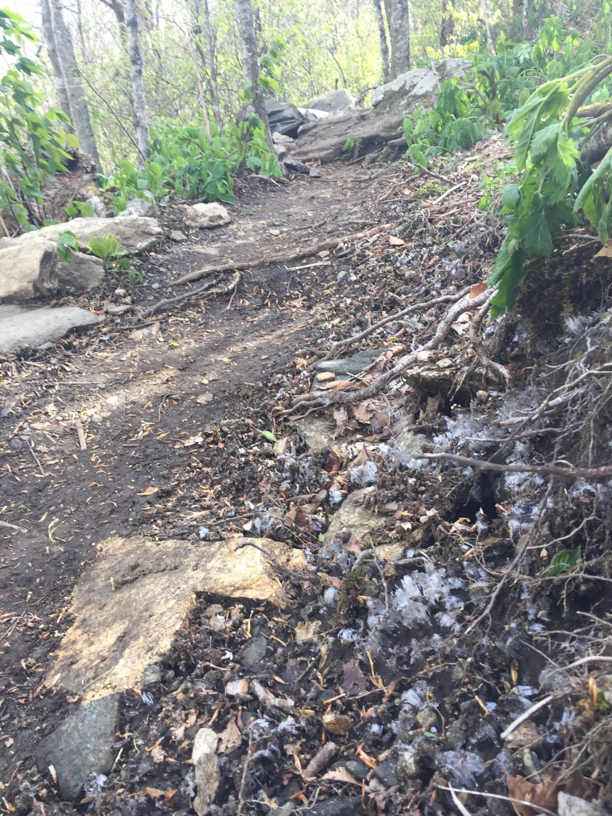 I was cold all morning, and eventually I was up far enough that I started seeing frost flowers (are these frost flowers? I’ve been calling them that since January).