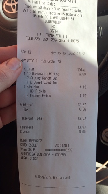 I got in my car and hit up the first McDonald’s I saw. This is my receipt. I ate all of it. (I would have more food pictures but those were the only times I was eating while I was stopped. I know y’all are disappointed.)