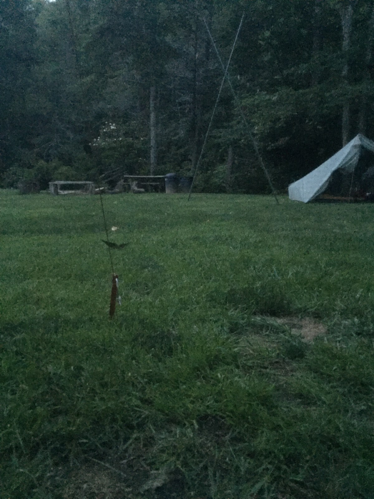 Well, that was easy enough: there were no campsites. We walked in the dark for miles (literally miles, in this case). The trail was rocks and snaked around a mountain, with the lights of the town peeking through the trees. We stopped at any promising bit of land, but nothing was even close to flat or clear enough for one tent. We did see a nice huge green lawn, but there were Posted signs all around, so we back off, assuming a private landowner was not fond of hikers.