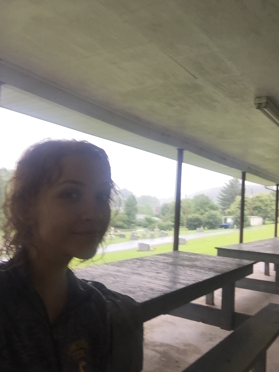 The road came upon us. We were wet and I was cold and muddy. There was nowhere to shelter from the rain, so we walked down the road to a church and took shelter under a pavilion there while we waited for our shuttle.