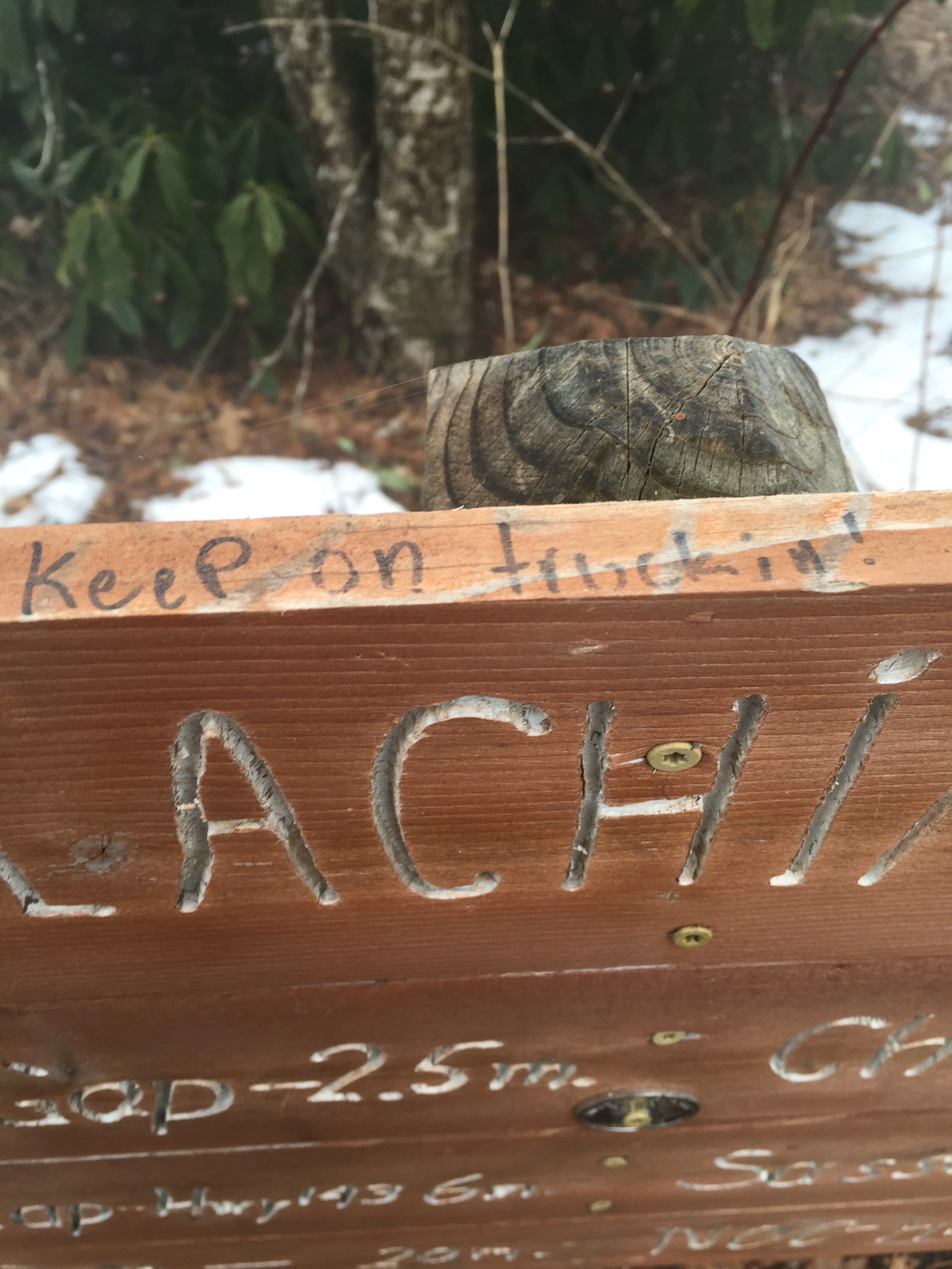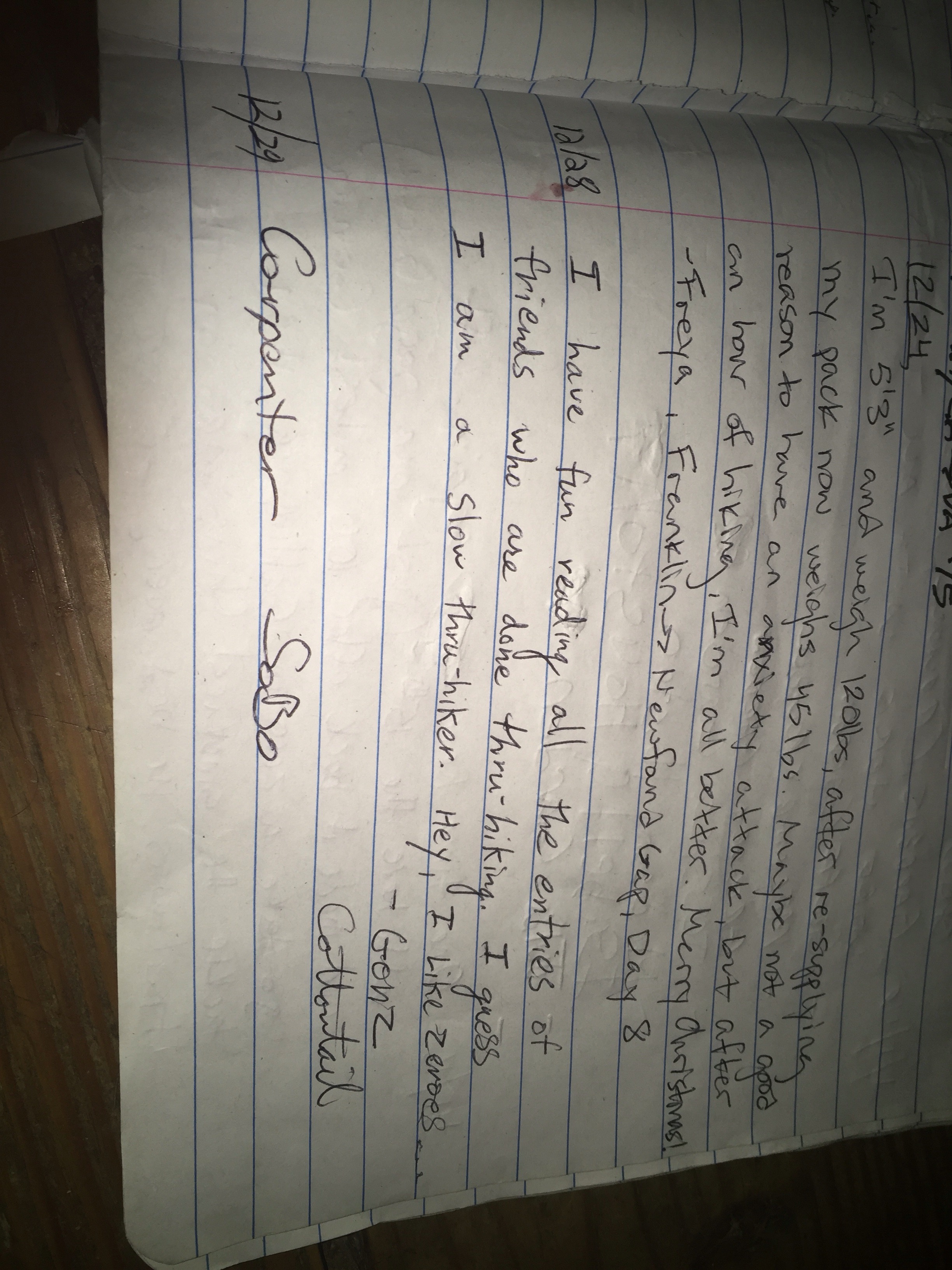 When I was toasty inside and outside (remember dinner was 7 hours ago and my body, at this point, had suddenly had violent flashbacks to the tail end of the January hike so I’d been starving since 6.5 miles ago) I headed back to the shelter. I flipped to the shelter log until I found what I was looking for. First, I saw Pajamas, the friendly bearded stranger I met on the trail one day. Then I found Carpenter and Gonzo.