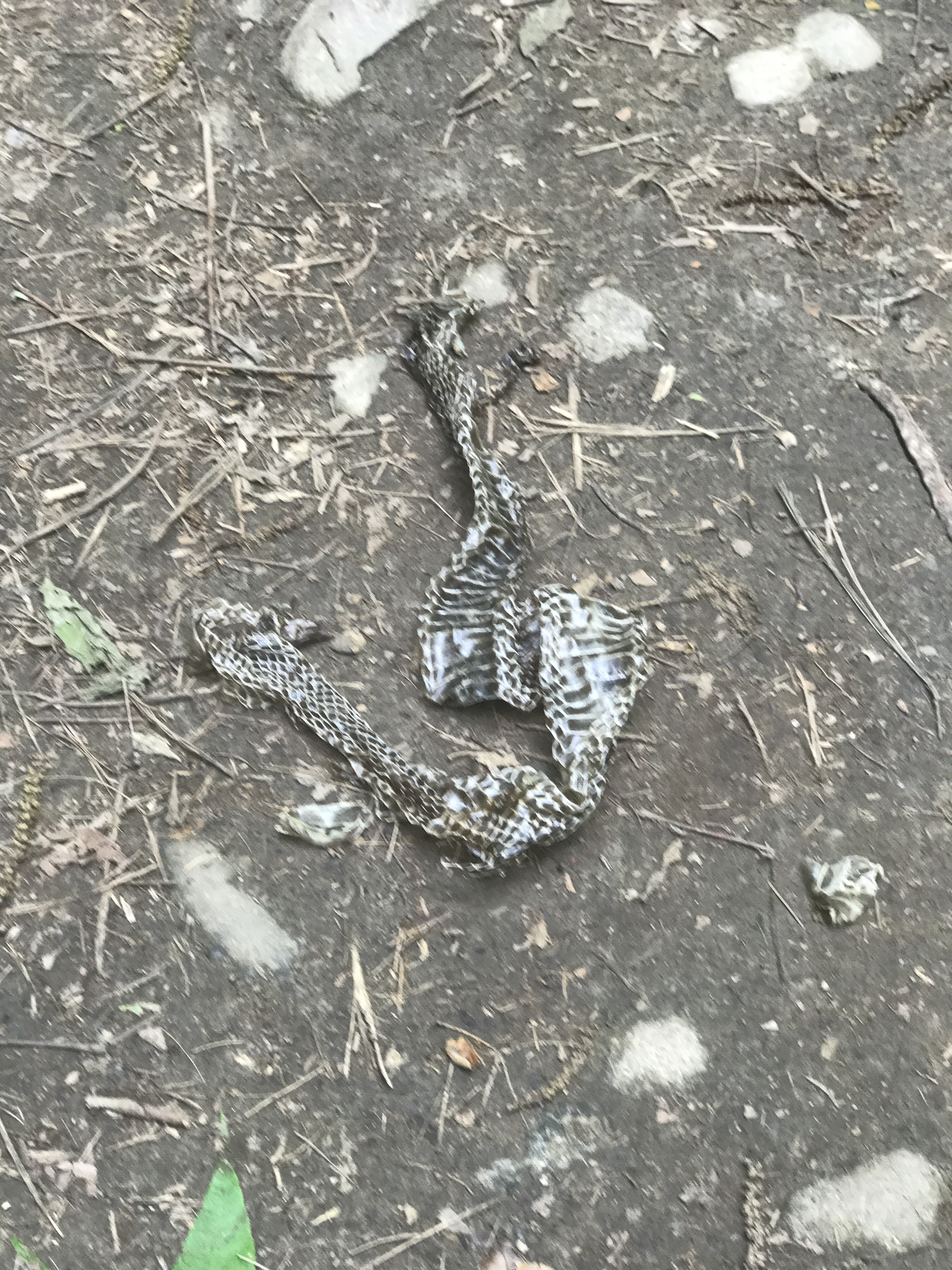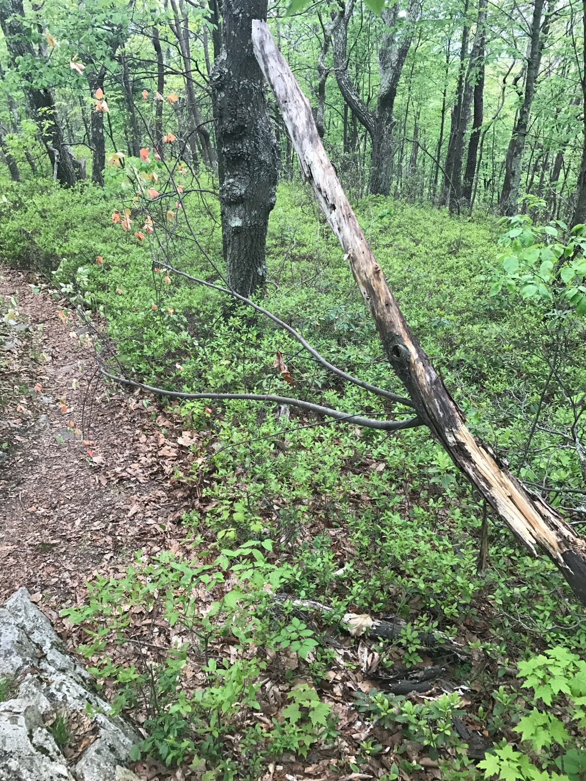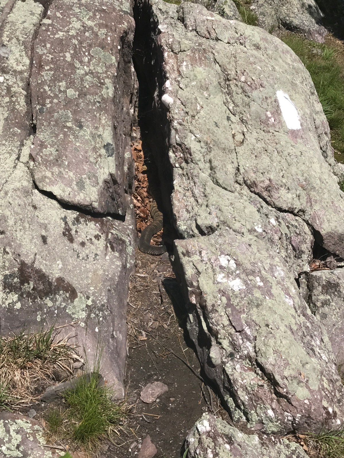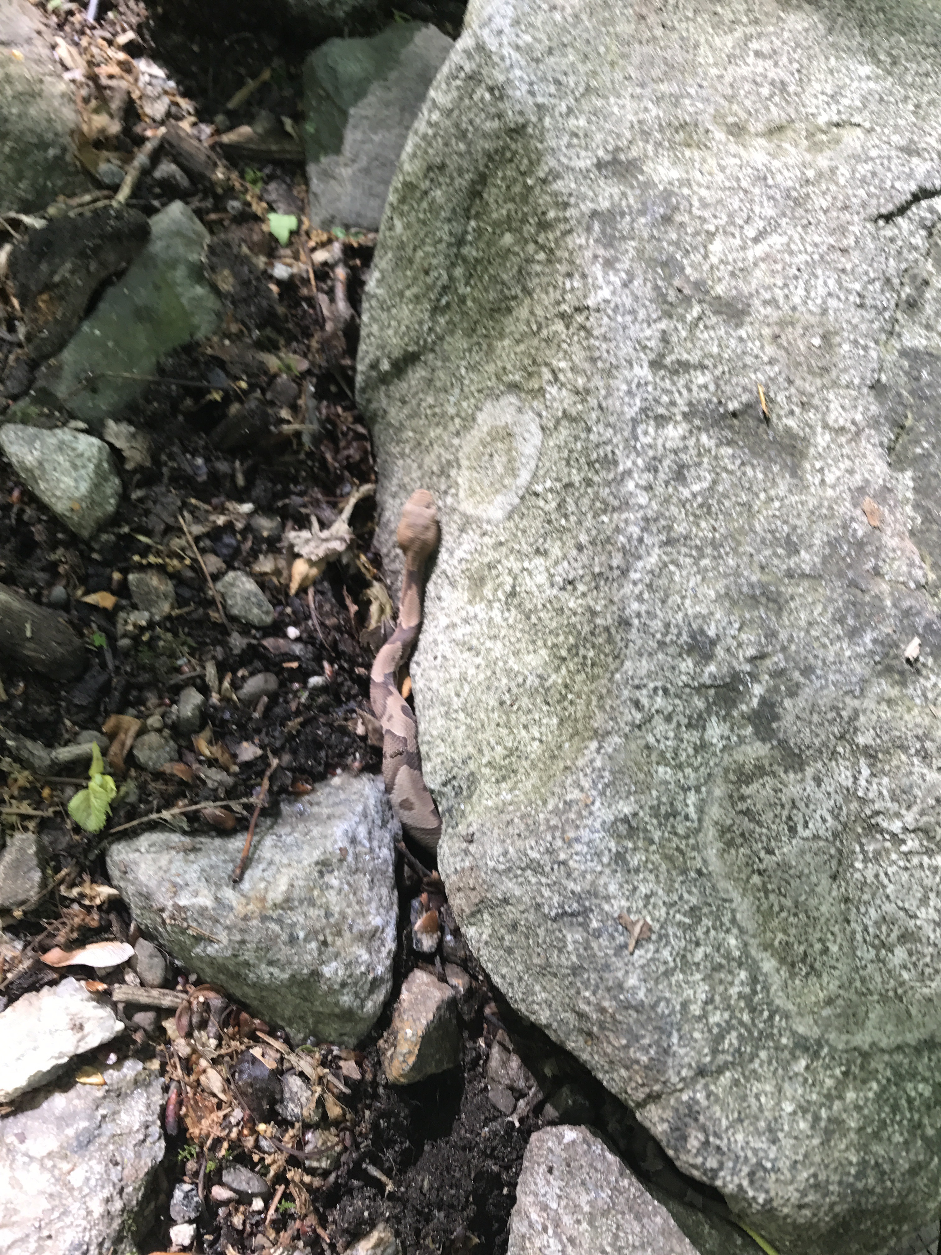 We hadn’t even got back on to the trail when we had our first wildlife encounter. The shelter is .5 off the AT, and we looked up and saw a stick in the trail. And then we realized it was a rat snake. We clacked our poles until he slithered off into the bushes.