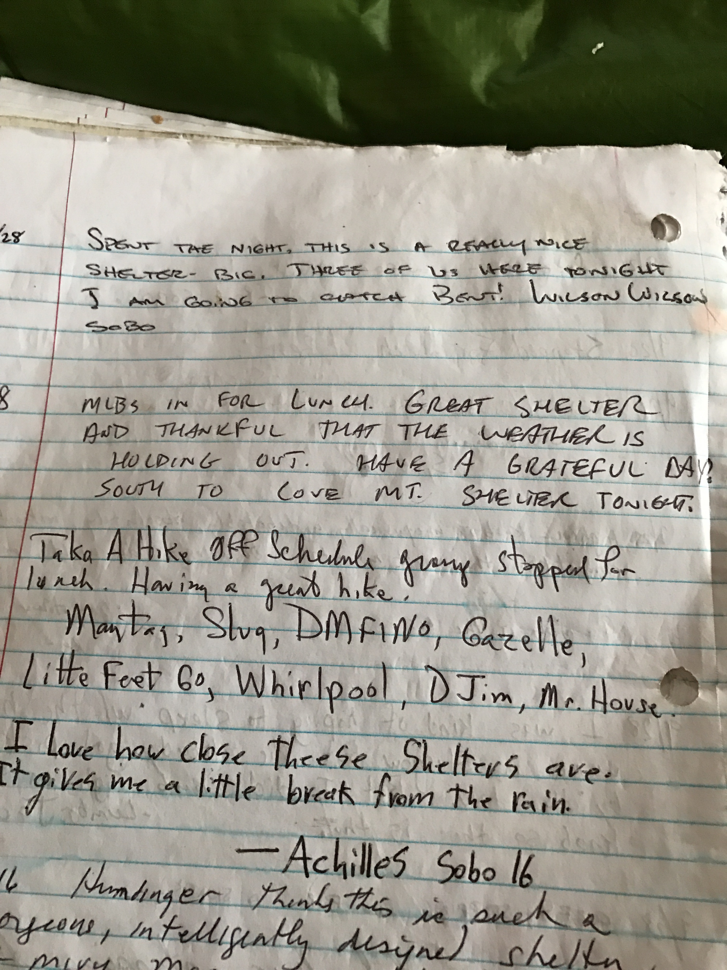 And eventually…we ended up at Bobbletts Gap. We were all exhausted and hungry. We didn’t bother with a fire, which is really saying something for us. We just sort of fell into bed and ate there and tried to hydrate. The shelter is an annoying .2 off the trail but it’s so well-set up- the privy is clean and it and the water are close and both on level paths, which is nice. The water has a great flow and it’s nice to listen to. It’s a good shelter, really. It’s no palace like Bryant Ridge but I’d stay here again, for sure.