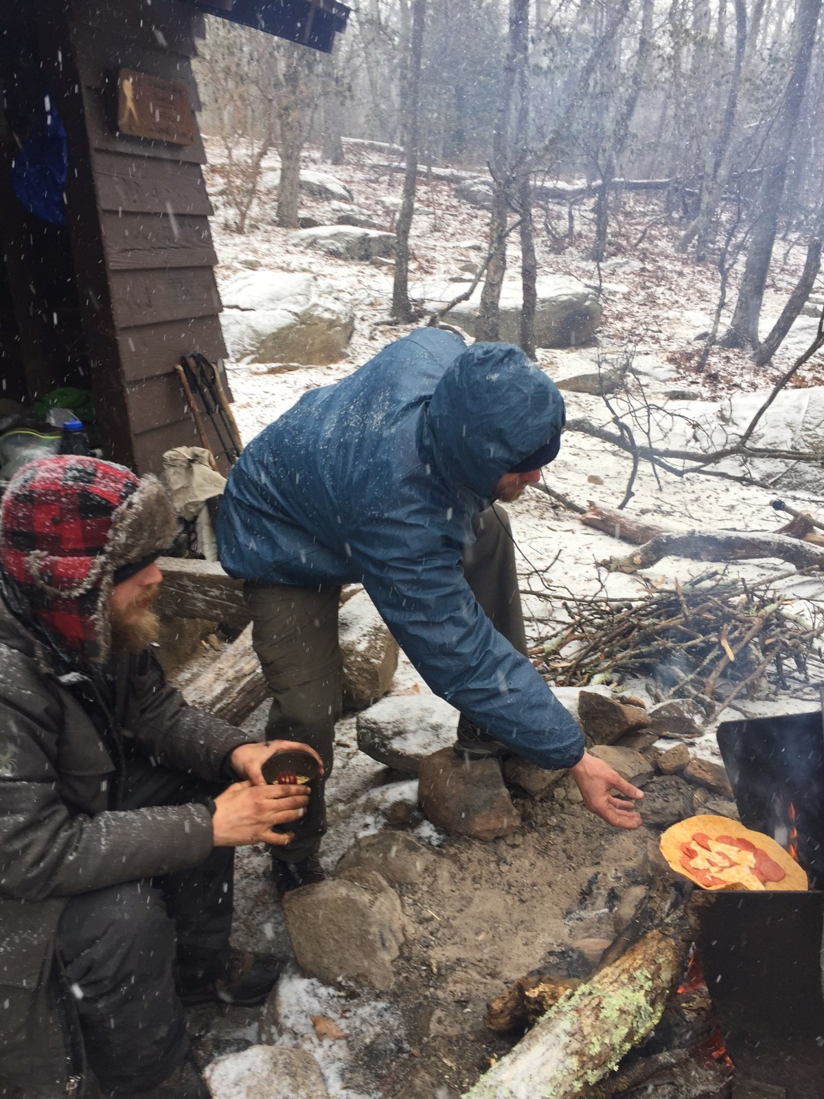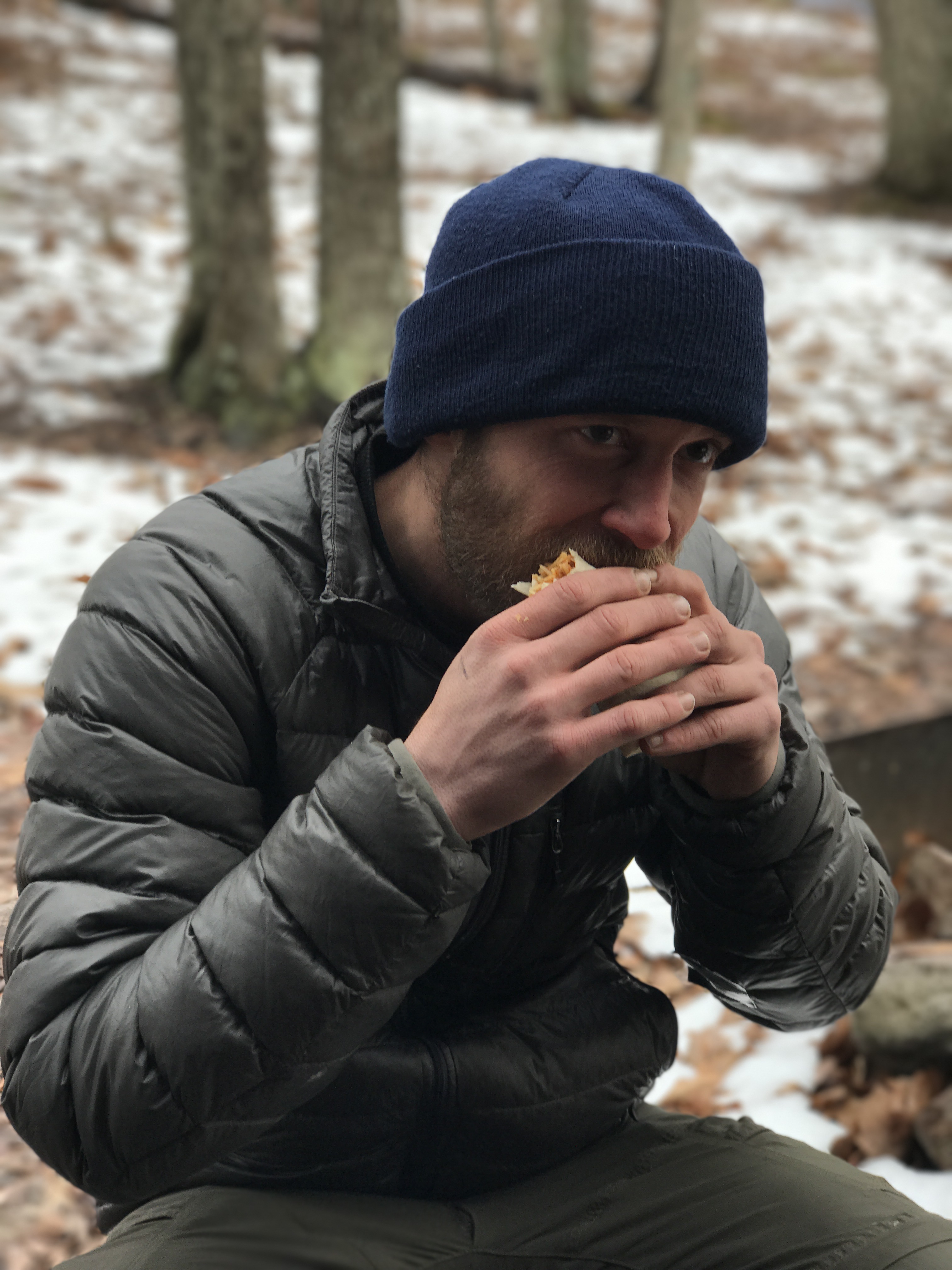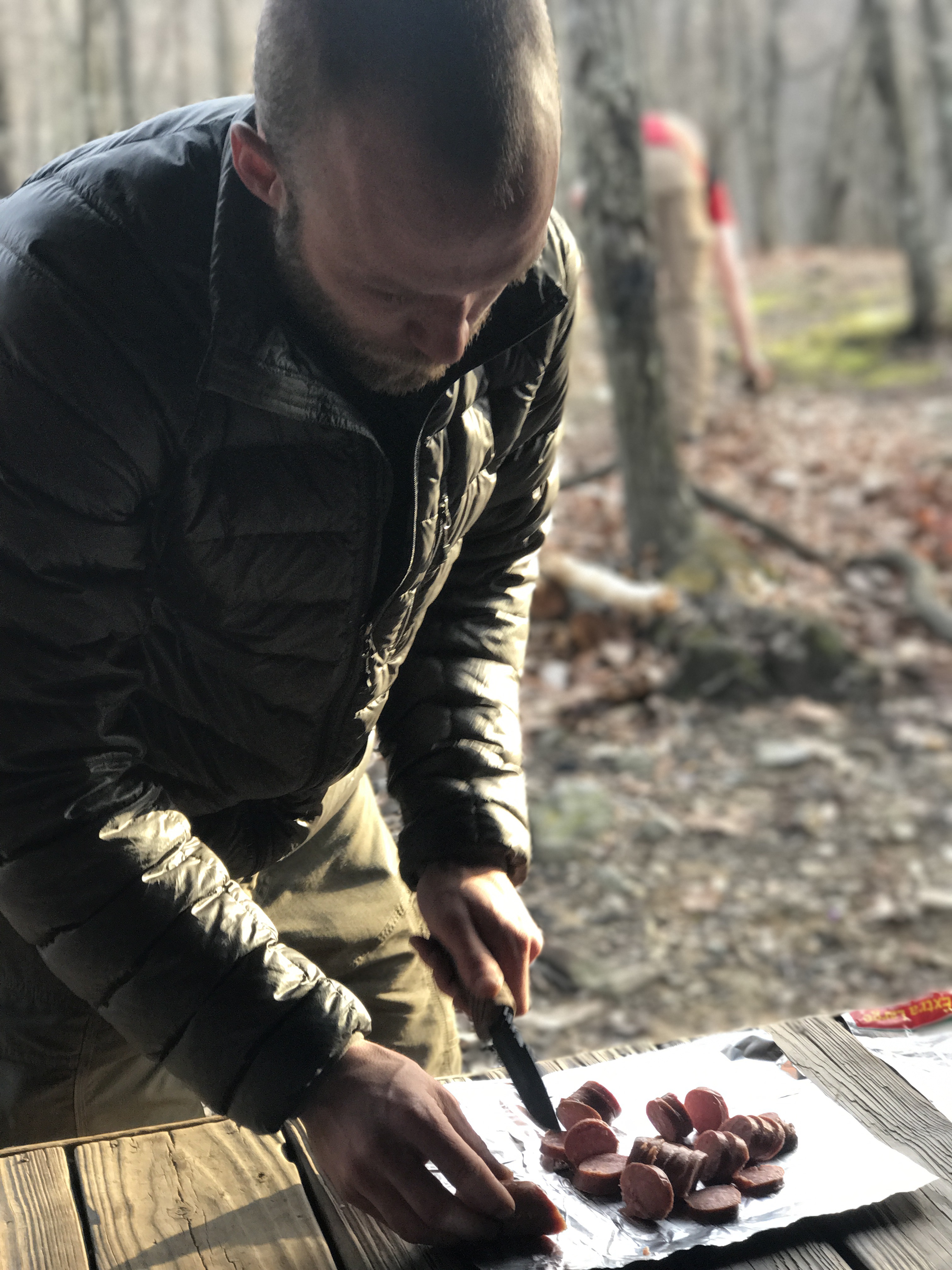 And best of all, this shelter was one Graybush and Raingear had left a ton of firewood neatly stacked and covered at. We broke trail off a fire road and got a fire going for our first communal feast- sausages, potatoes, onions, boneless ribs, and cheese. Expertly cooked by Rabbit and Sar Tec.