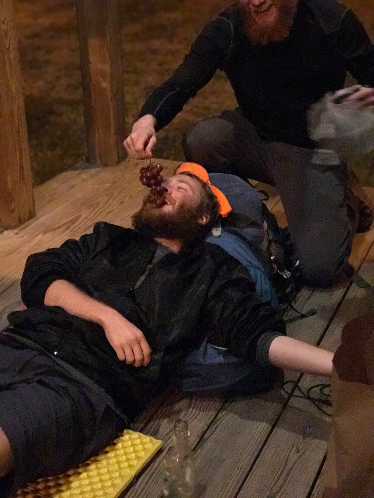 The shelter was full, so we had to tent. It rained, but tribal leader and the guys got a fire going anyways, and cooked a feast: sausage and steak and catfish, veggies and spices. I had wine and bread and cheese to eat while it cooked. We passed back extras to the weekenders in the shelter, and impressed them with our culinary skills. Well, the boys did. I just stood around and broke up kindling and passed around the wine. Not a bad gig if you can find men who like to cook and build fires.